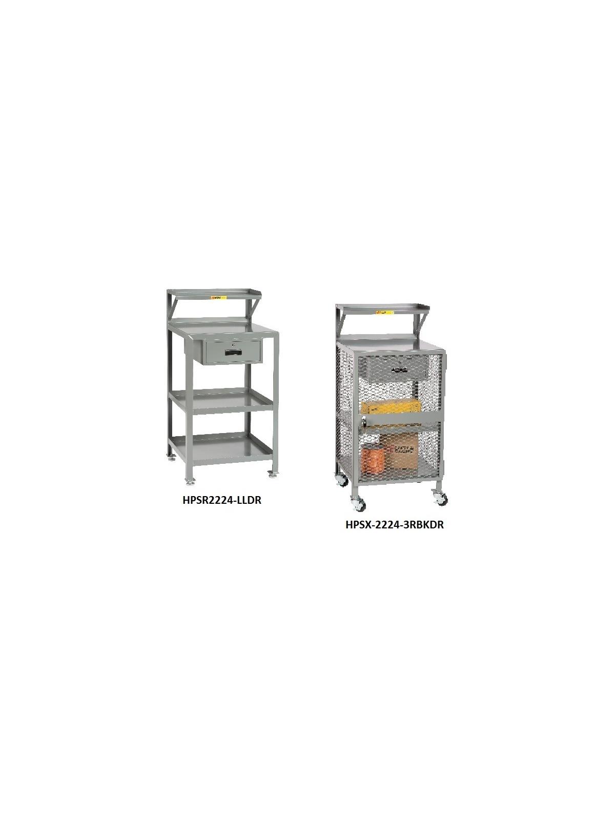 All-welded construction with comfortable height as a standing desk/workstation. Riser shelf is 10" deep and 10" above desk surface. Locking storage drawer is 13"W x 17"D x 4-1/2"H and comes with two keys. Lower shelves have 1-1/2" retaining lips and 11-3/4" shelf clearance. FOB Shipping Point.