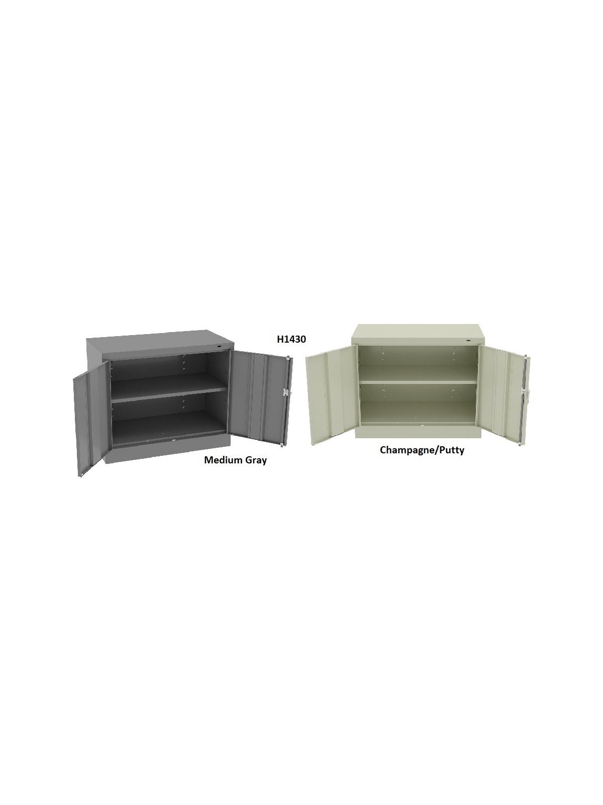Shelves adjust in 2" increments. Heavy-steel construction with leaf hinges and reinforced doors stand up to a lifetime of heavy use. Handle on right-hand door activates the three-point locking system to keep belongings secure. Raised base keeps contents from contacting moisture from the floor. Available in Black, Champagne/Putty (shown), Sand, Light Gray and Medium Gray (shown). FOB Shipping Point.