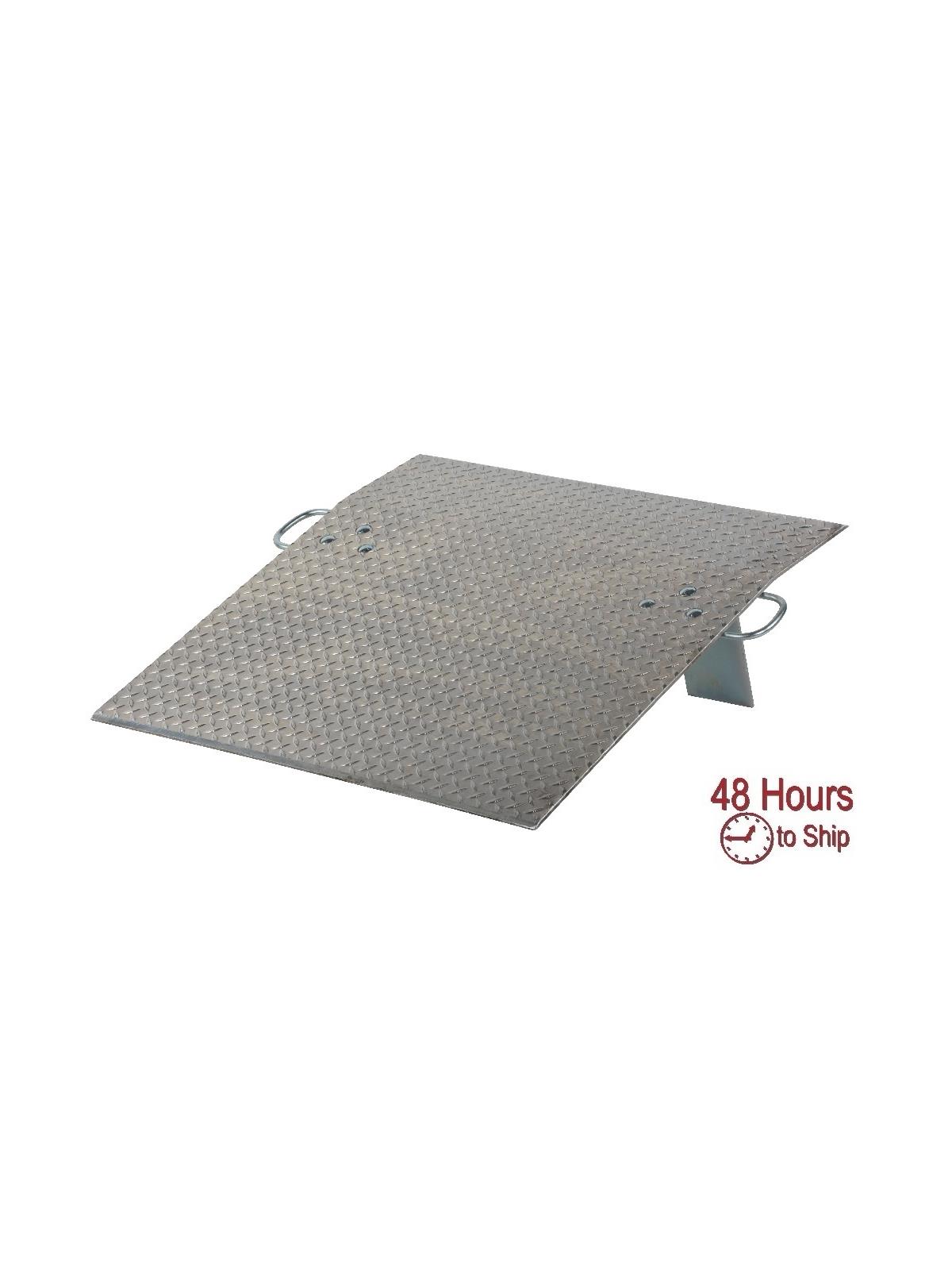 Aluminum Hand Truck Dockplates are designed for use with two (2) wheel hand trucks. It is a convenient, safe, and easy way to access loading docks from trucks. This dockplate is lightweight and easily transported by just one person. The tread plate surface ensures skid-resistant safe traction and the locking legs secure the plate for safe loading and unloading. Complete with bolt-on carrying handles and locking legs. The bend is 11° and located 9" from edge. FOB Shipping Point. Add 6" to get overall width. Due to tariffs and market conditions, pricing is subject to change.