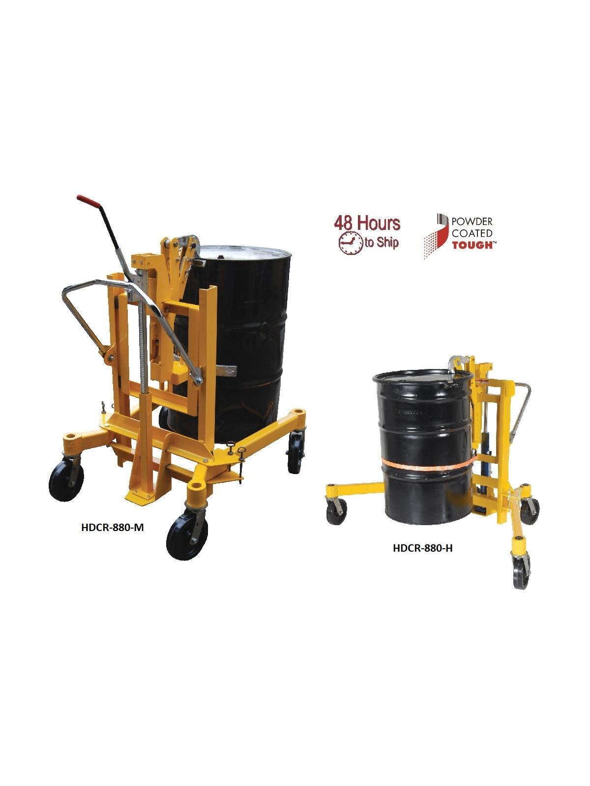 Unique portable unit designed to lift and transport steel, plastic, and fiber drums with a top lip. Steel jaw securely grips the top lip of the drum. Available with either a manual mechanical ratchet or foot pump hydraulic. Straddle legs rotate for access to drums on pallets. Units roll on four (4) 8" x 2" phenolic swivel casters. The push handle folds down for easy access to ratchet and foot pump. All welded steel construction. Baked-in powder coated toughness with a safety yellow finish. FOB Shipping Point.