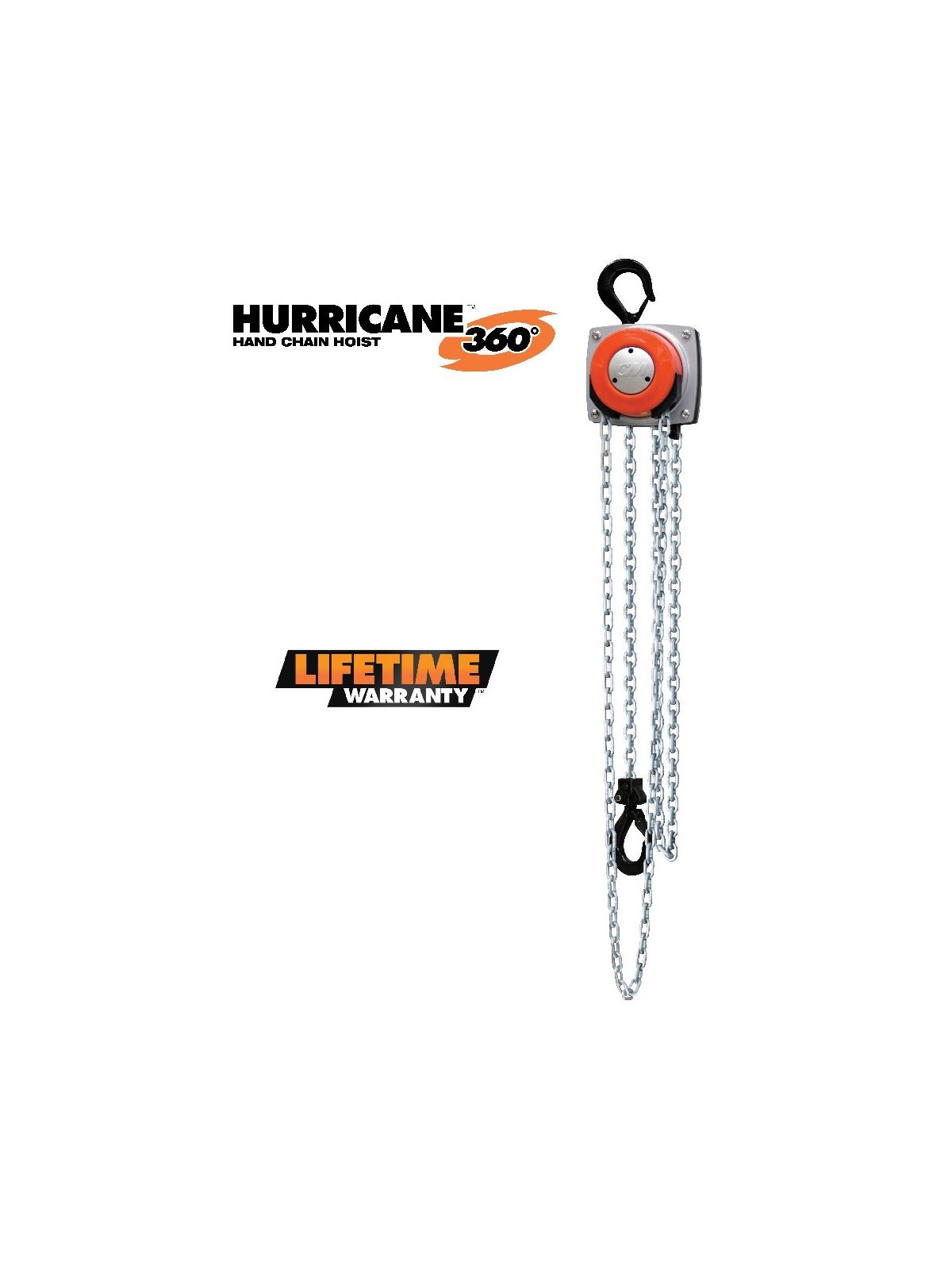 The Hurricane's patented chain cover rotates a full 360 degrees, allowing loads to be lifted, positioned or pulled from virtually any angle - even in confined spaces. FOB Shipping Point.
