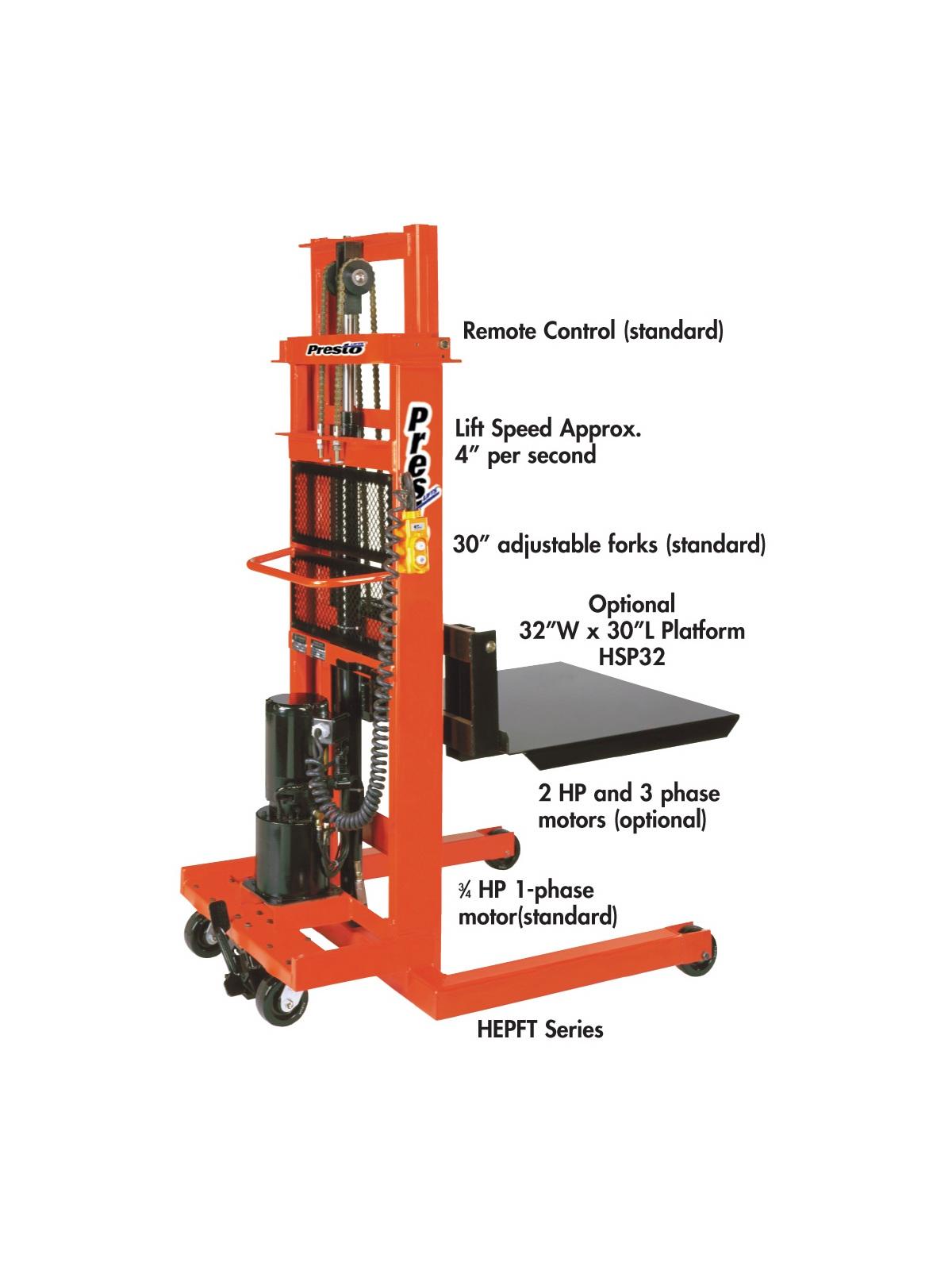 This rugged electric lift is ideal for congested and compact work areas. Perfect for all types of lifting or positioning work. Built to withstand the daily rigors of lifting heavy loads. Lifts 4" per second with 3/4 H.P. 1-phase motor. 30" adjustable forks are standard - optional platform sold separately. 18" Load Center. FOB Shipping Point.