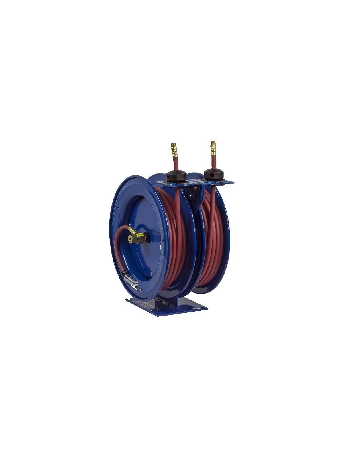 Compact two reel assembly for dual hose applications, each reel operates independently. Guide arm adjusts to wall, floor and overhead positions. Single expanded, 1/4" steel mounting base for increased stability and space efficiency. One mounting pattern allows 1/2 the installation time required to install 2 reels at one station. 1" solid steel axle and lubricated precision bearings for smooth rotation. Durable proprietary CPC™ powder coat process. Rolled edges and ribbed discs provide strength and safety. FOB Shipping Point. Surcharge may apply. USA Made. 2 Year Manufacturer's Limited Warranty. See Related Items tab for Air/Electric Combo Reels.