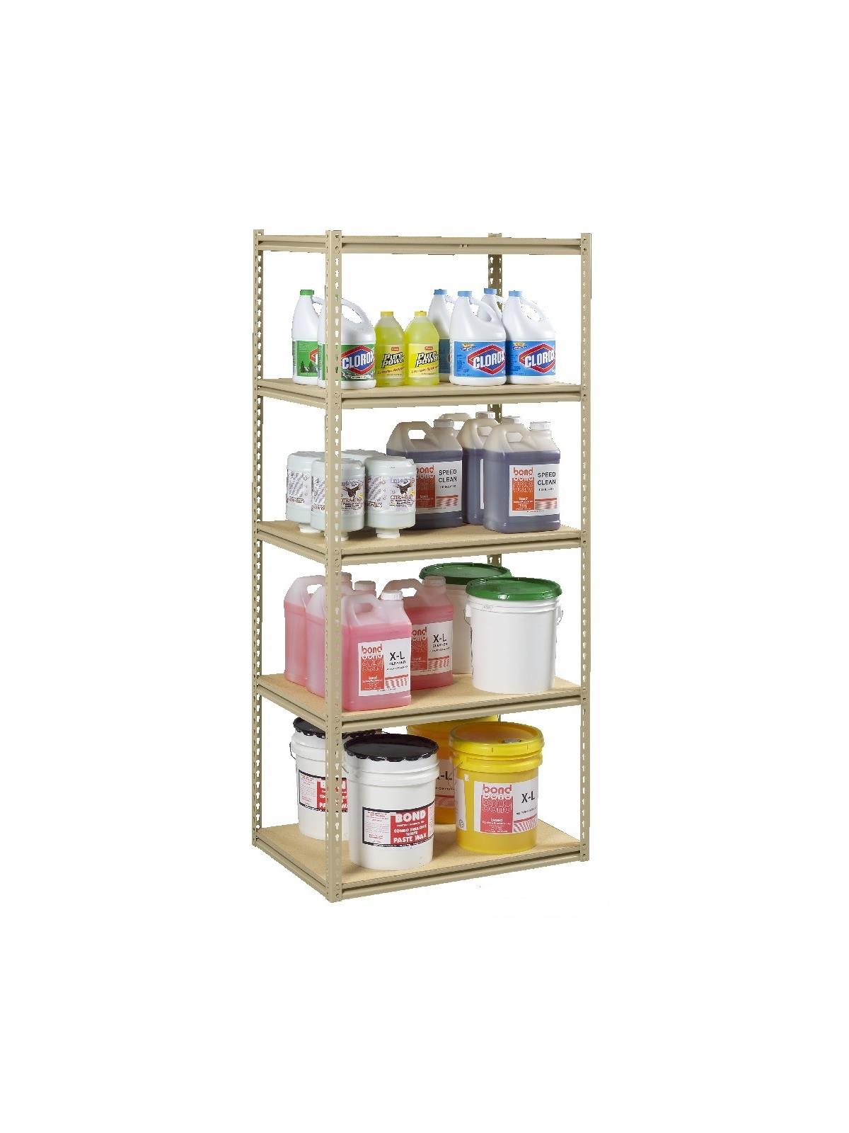Posts and supports are designed with double rivets and keyhole slots to form a rigid framework. The design allows access to the shelves from all sides of the unit. Assembly is easy with only a rubber mallet required. Shelves are supported on all four sides with V-designed shelf supports, and 36" deep units have one center support for added strength. The units have 5 shelf levels (4 openings). Buy the unit with 5/8" particle board decking. Available in Sand or Medium Gray, specify in comments when ordering. FOB Shipping Point.